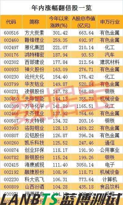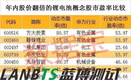 數(shù)據(jù)寶統(tǒng)計顯示,剔除近一年上市的次新股,25只個股年內(nèi)漲幅在100%以上。值得注意的是,7只個股來自鋰電池板塊,分別是方大炭素(600516)、贛鋒鋰業(yè)(002460)、雅化集團、華友鈷業(yè)(603799)、先導(dǎo)智能(300450)、天齊鋰業(yè)(002466)、融捷股份(002192)。