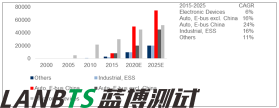 2015-2025,動力電池將成為全球鋰電池市場增長主要領(lǐng)域(單位:MWh)